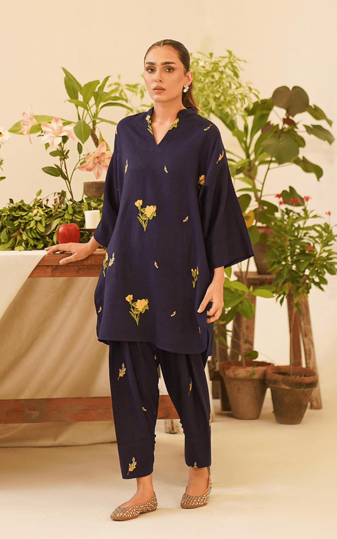 This stunning two-piece embroidered set features a round neckline and straight sleeves, showcasing elegant embroidery...