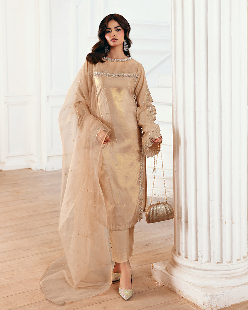 Stunning crinkle zari chiffon shirt, beautifully adorned with sequin embroidery, sparkling diamante pearls, and playful...