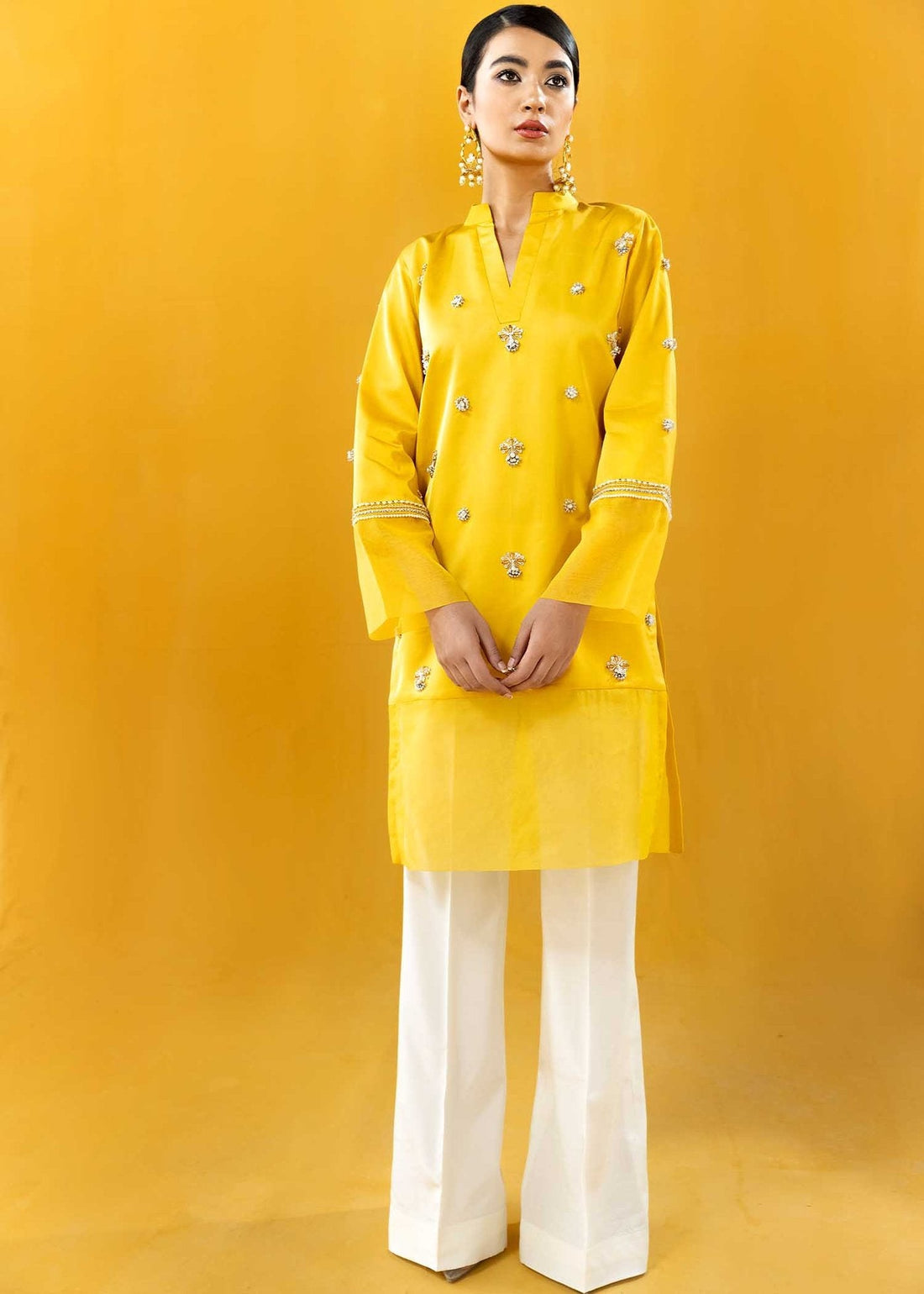 Aurora, shines with grace over a fine pure organza satin fabric. Bright Mustard yellow colour...