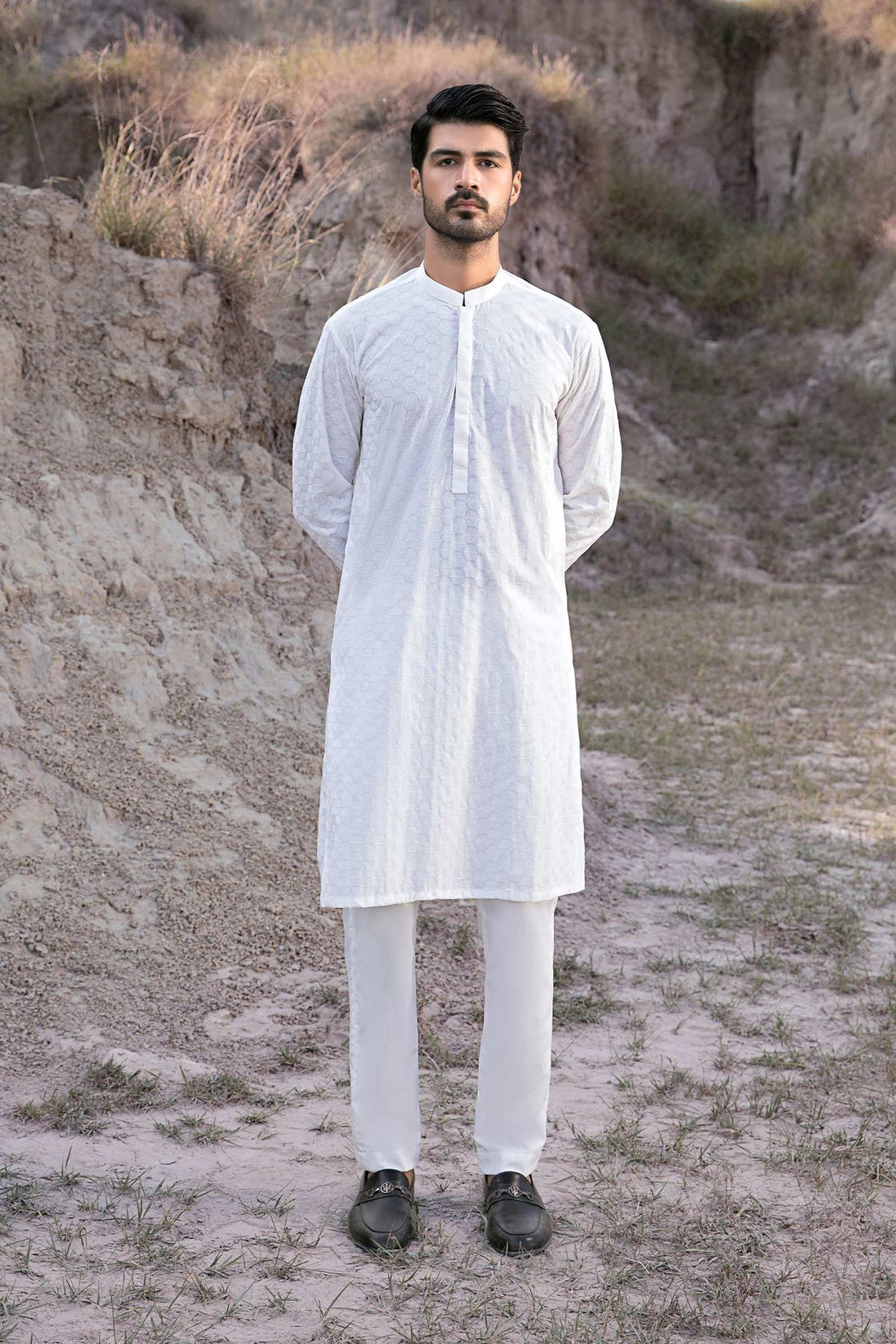 Dyed Embroidered KurtaBan NeckHidden PlacketFull SleevesOpen CuffTwo Side PocketsStraight HemColor: Off WhiteFit: RegularWear Type: FormalFabric:...