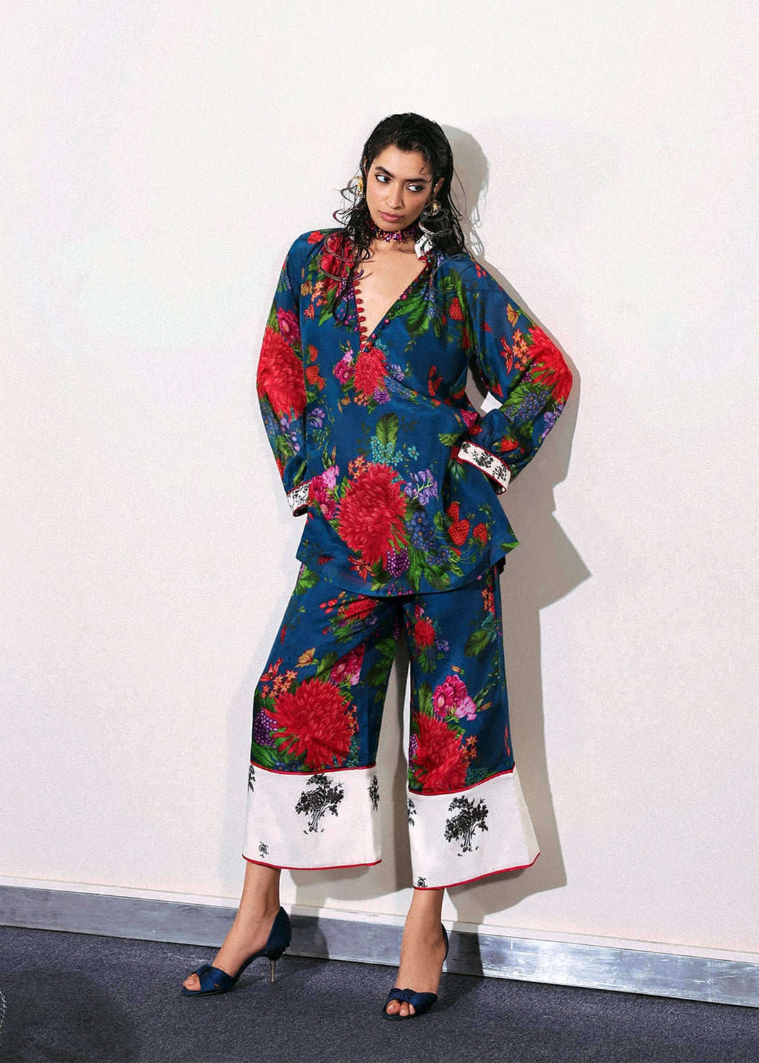 A bold floral printed coord set in cobalt blue silk, featuring a short shirt with...