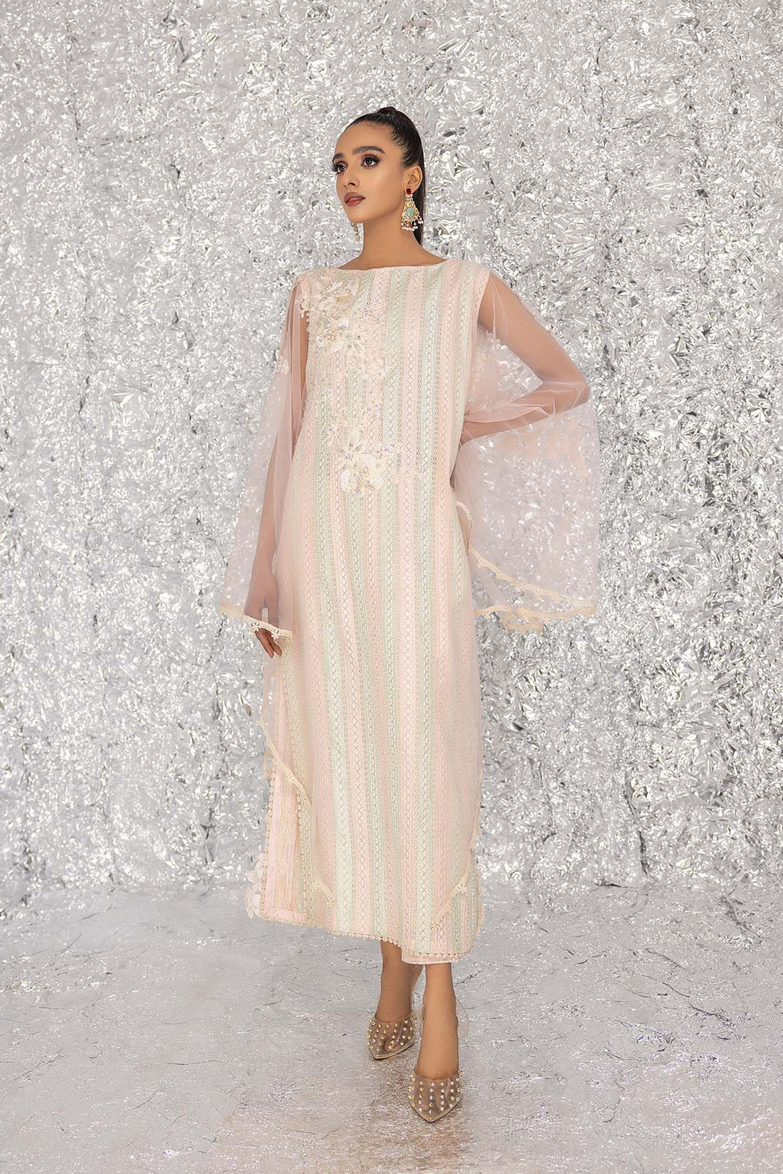 Experience the enchantment of our kaftan, adorned with exquisite tilla, sequence, and resham embroidery. Effortlessly...
