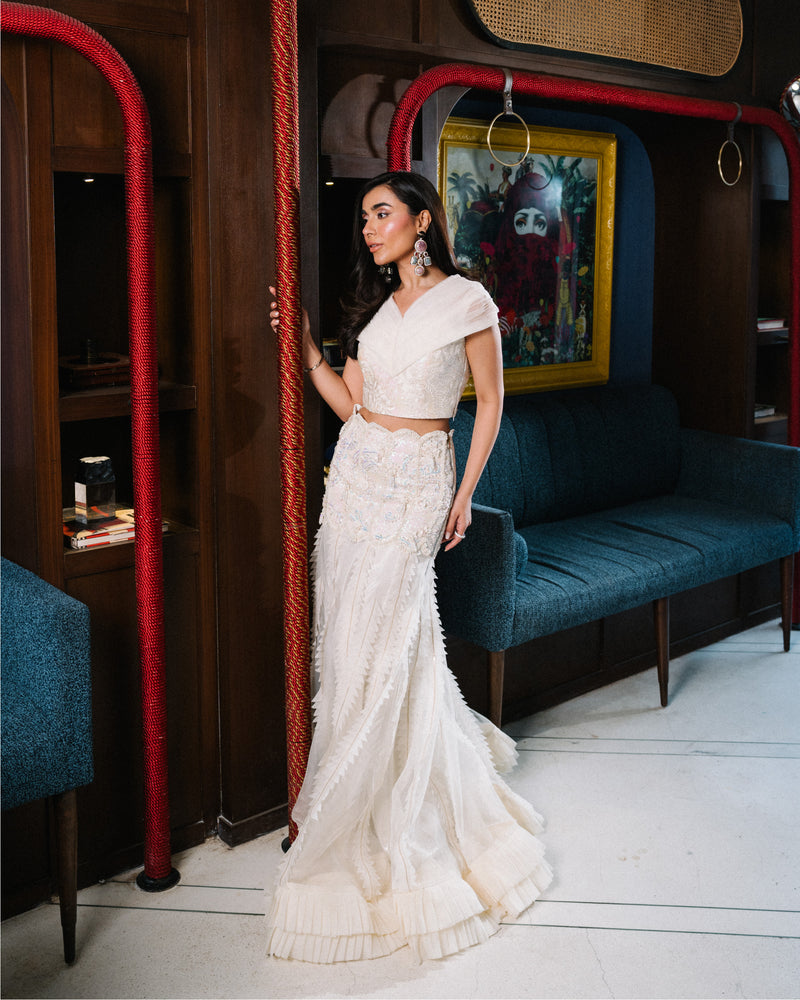 This ivory organza suit, which is ageless and epitomizes sophistication, exudes sheer beauty. The airy...
