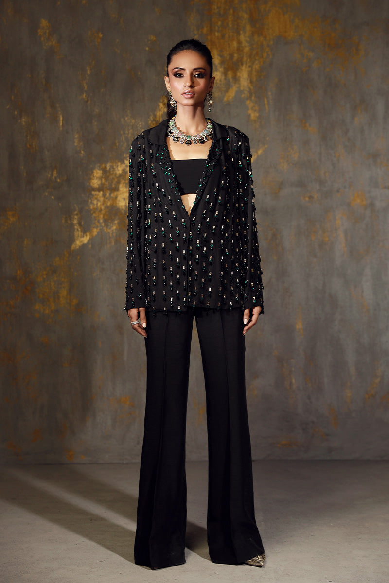 Make a bold statement with this formal handcrafted jacket, featuring intricate zardozi, crystal, and beadwork,...