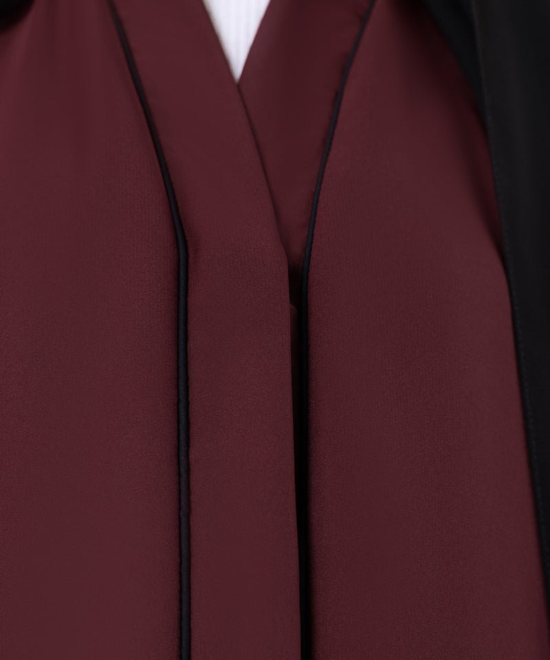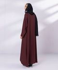 Full length abaya in soft drapey fabric. Button through front opening with V neckline and full sleeves with contrast piping detail.