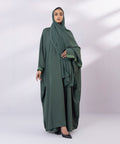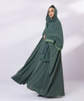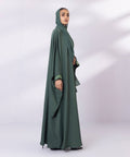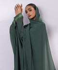 Full length kaftan abaya set in soft and drapey fabric. Featuring crew neckline with long slit and fabric button closure. Embroidary detail on cuffs. Embroidered hijab included.