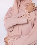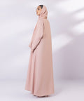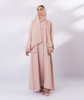 Full length abaya in a soft drapey fabric. Button through front opening. V neckline. Full sleeves with net detail. Hijab included.