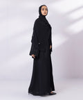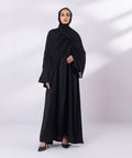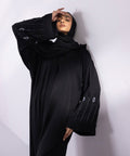 Full length abaya in soft drapey fabric. Button through front opening. V neckline. Hand embellishment on the sleeves and hijab.