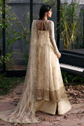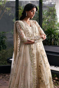 An opulent off white front open shirt intricately embellished with gold threadwork, sequins and detailing. Paired with a voluminous lehenga and a sheer dupatta featuring ornate borders. This ensemble exudes timeless grandeur - perfect for nikkah receptions in elegance.