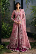 A dreamy rose-pink front open shirt adorned with intricate silver threadwork and delicate embellishments that cascade gracefully over the flowing silhouette. Paired with a richly embroidered magenta sharara and a sheer dupatta featuring finely detailed borders, this ensemble evokes a garden fairytale - elegant, ethereal, and made for timeless celebrations.