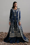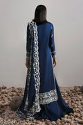 Regal midnight elegance - a fluid midnight blue silhouette illuminated with intricate ice-blue and ivory embroidery on shamoz. Borders and panels trace a story of craftsmanship, while the timeless drape creates a statement of strength and grace.