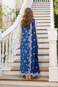 A deep royal blue ensemble designed with clean lines and effortless elegance, featuring a sleeveless long shirt adorned with intricate white floral embroidery that traces the front panel and hem. Delicate lace-like detailing adds contrast and texture against the rich base, while scattered motifs lend softness to the structured silhouette. Paired with a matching dupatta draped simply over the shoulder, the look feels balanced and refined. Light, breathable, and graceful in movement, the ensemble captures a sense of modern ease grounded in artisanal detail.