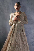 The magnificent peach-pink angrakha-style gown is a beautiful combination of modern appeal and traditional grandeur. This luxurious creation, crafted from opulent organza fabric, features intricate embroidered panels enriched with pearls, cutdana, and beadwork. Subtle accents of light gold tilla and shimmering golden sequins add a radiant touch. The ensemble is completed with an embellished organza dupatta, framed by an intricately embroidered border, exuding a modern yet everlasting grace.
