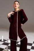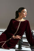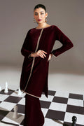 The royal maroon Set Includes a solid shirt and pants with a round boat neckline with front slit embossed with lace-pure premium velvet with a subtle sheen produced in-house!