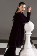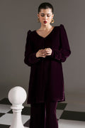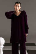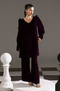 The Royal Plum Set Includes a solid shirt and pants with a v neckline and puff sleeves with long cuff finished with banarasi buttons -pure premium velvet with a subtle sheen produced in-house!