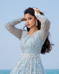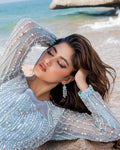 Introducing our stunning net ice blue maxi, enriched with intricate handcrafted adda work. This exquisite piece showcases a captivating combination of materials, including pearls, Swarovski crystals, and multi-shaped sequins.