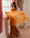 Raw Silk ensemble, meticulously crafted with sequin embroidery, pearls, stones, and crystal embellishments.