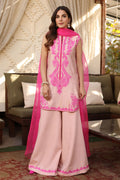 Peach cotton net shirt with exquisite embroidery, paired with an organza dupatta And loose pants. Effortless elegance for every occasion. Sleeves can be added.