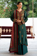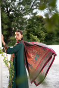 A bottle green sheesha Silk shirt with embroidered front and sleeves, paired with Korean raw Silk loose pants. Finished with a striking printed Silk dupatta for a complete, elegant look.