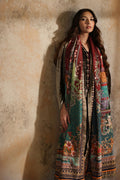 A taupe grey velvet long shirt with a loose fit and hand worked neckline, paired with Korean raw silk trousers and a beautifully printed velvet shawl, offering a refined and sophisticated look.