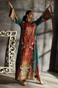 A beautifully crafted velvet kaftan featuring a fusion of vibrant multicolor prints, highlighted with subtle embroidery on the neckline for a graceful touch