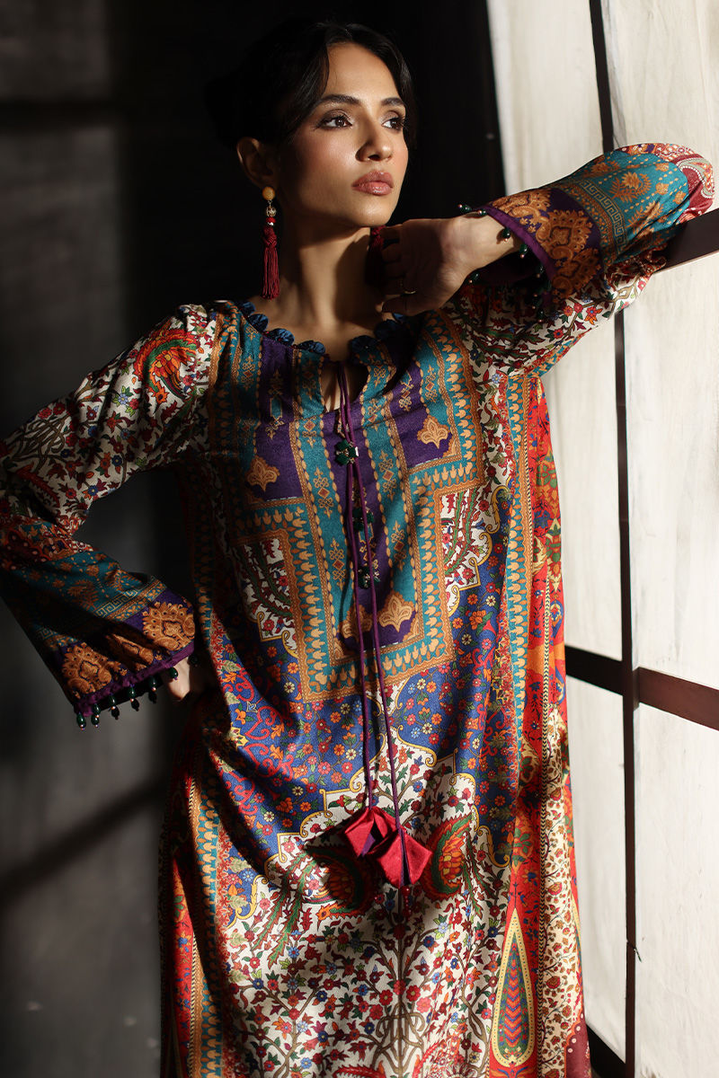Crafted from velvet, this multicolored printed kaftan with lightly embroidered neckline captures an elegant yet contemporary aesthetic.