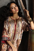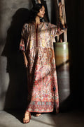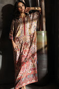 Crafted in soft velvet, this kaftan is defined by its vibrant multicolor pattern and lightly embroidered neckline, offering timeless charm with a modern touch