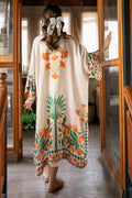 Floral prints on flowy silk make this kaftan a standout, especially when worn with simple pants.