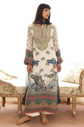 This ivory ensemble stands out with a detailed green neckline and intricate embroidery. Accented with tropical designs and colorful borders, it blends elegance with modern charm.