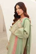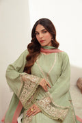 Unveil timeless beauty with this mint green Korean raw silk A-line shirt. Lavishly decorated with delicate resham embroidery in beige, peach, and mint threads, and accented with tilla and sequin embellishments, this outfit radiates elegance. Paired with a silk dupatta edged in peach and tailored straight cut pants, it's the ideal choice for an effortlessly chic and graceful appearance.