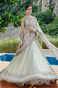 Elysian' - an ethereal creation that's a work of art. Mint zaritissue lehnga with tulle dupatta comes alive with scintillating florals, and iridescent details accentuate the composed blouse with zari tissue lehnga embellished at the bottom. Hand-placed sequins, crystals, and seed pearls add a touch of glamour to the silver, gold and silk thread-worked blooms. The dreamy tulle dupatta features intricately sequins embroidered all over pattern with borders and elaborately gotta worked , making it a showstopper that's sure to captivate. With its classic, elongated silhouette, 'Elysian' is a treasure that you'll cherish forever.