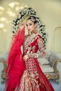 A deep red front and centre slit gown embellished with crystals, dabka and glass beads featuring a gorgeously regal brocade lehenga.