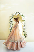 A peach colored pishwas and skirt with foil printed lehenga embroidered with intricate embellished details. The pishwas features a striking blend of 3d petals and flowers, dabka, crystals and cutdana. Completing the ensemble is a sheer embellished dupatta in similar tones.