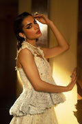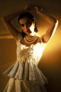Introducing the "Ruba" dress, a signature masterpiece of elegance and intricate craftsmanship. This stunning ensemble features a mini-panelled embroidered skirt adorned with all-transparent sequins, creating a shimmering, ethereal effect. Paired with a lace peplum top, the design is elevated by an embroidered organza lower peplum, embellished with delicate sequins. The 3D finishing details bring modern sophistication to this timeless creation. Perfect for making a lasting impression.