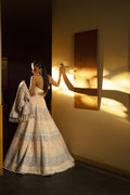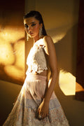 Introducing "Zirah," a signature masterpiece that blends elegance with modern craftsmanship. This exquisite dress features a lace bustier paired with a delicately embroidered upper cape adorned with intricate hand embellishments-pearls, Swarovski crystals, and cutdana. The striped skirt showcases bold color-block panels in pink, periwinkle, and aqua, adding a vibrant touch to this sophisticated design.