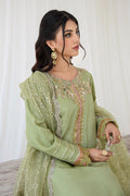 Engage yourself in the exquisite charm of the Celosia, A korean raw silk ensemble with delicate old-school embellishments along the neckline and sleeve. Completing the look with straight pants and a silk dupatta with customised tilla made finishings.