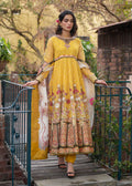 Saffron yellow pishwas set intricately embroidered in black and white thread work, featuring delicate motifs that adorn the fabric, creating an elegant silhouette. Paired with an embroidered white organza dupatta, showcasing geometric borders with intricate embroidery, crafted from lightweight organza fabric with a soft, flowing texture.