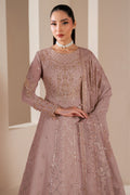 The "Saffron" ensemble in soft pink radiates timeless elegance, adorned with intricate pearl embellishments on a luxurious chiffon base. The meticulously crafted neckline, highlighted with gold embroidery, adds an extra touch of sophistication. Paired with a chiffon dupatta featuring a delicate embroidered border and raw silk trousers, this outfit creates a flawless, formal look.
