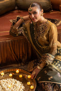 Zabreen is a captivating ensemble that blends ochre yellow and dark green on lightweight chiffon fabric. It features delicate threadwork and motifs on the neckline and hem, paired with tonal raw silk trousers. This outfit is designed to shine on any occasion.