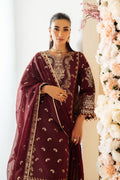 The Salsa ensemble features a luxurious maroon raw silk outfit, adorned with intricate copper-gold threadwork and shimmering sequins. It is complemented by a delicately embroidered chiffon dupatta, ideal for both traditional and contemporary draping styles, paired with elegantly embroidered raw silk trousers, adding a sophisticated touch.