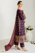 Scarlet is a plum raw silk ensemble with dense embroidery in rust and purple thread, accented with sequins. This look is completed with a stunning printed chiffon dupatta, adorned with embroidered borders in dark pink hues, creating a harmonious and elegant look.