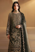 Jiya is an olive green two-toned chiffon shirt adorned with dull gold hand embroidery, sequins, and modern motifs on the front and back. It also features patterned sleeves and intricate handwork on the daman border. This ensemble exudes grace, paired with tonal trousers and a chiffon dupatta with a sequined border.