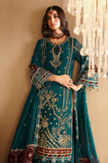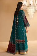 Khiva is a breathtaking sea green shirt, embellished with delicate handwork on the neckline and sleeves, featuring light gold tilla and sequins. Front and back motifs, enhanced by a floral border, add to its allure. Paired with an embroidered chiffon dupatta featuring an elegantly bordered pallu, and complemented by tonal embroidered trousers, this ensemble is the perfect choice for the wedding season.