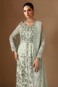 Sahar features an aqua pishwas with a delicately hand-embellished and florally embroidered bodice, highlighted by panel borders adorned with classic embellishments like tilla, sequins, and panni on a lightweight chiffon base. Paired with raw silk pants, the embroidered chiffon dupatta adds an ethereal charm, elevating the entire look.