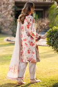 Let your style shine in "Sian." This digitally printed dull orange lawn shirt features floral prints in contrasting tones. It is paired with matching printed lawn trousers. A printed voile dupatta elevates the look, adding an extra touch of sophistication.