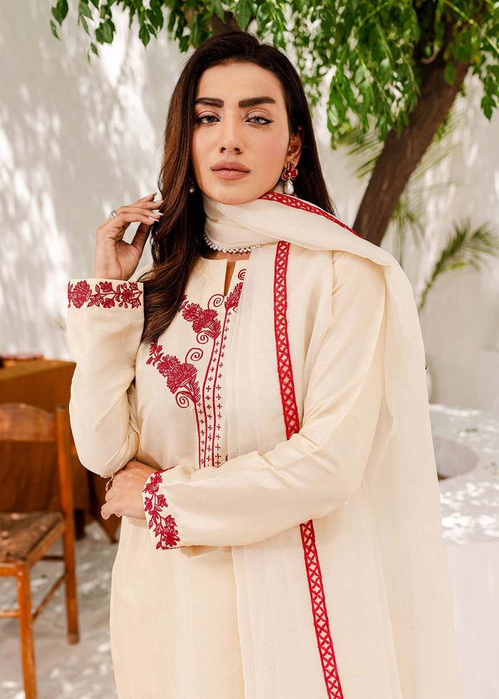 Graced with classic embroidery on the silk canvas for the shirt. Meline is a timeless antique white ensemble. The neck and sleeves have detailed embroidery. It comes with flared pants and matching sheer dupatta encapsulating elegance at it best.