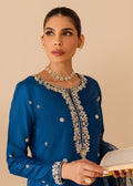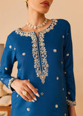 Celebrate festivities in style with this showstopper, Falak. This silk set is graced with embellished neckline and sleeves in the shades of silver and gold. Paired with straight pants and sheer block printed dupatta. Allow yourself to be enfolded in the embrace of timeless elegance and serene refinement.