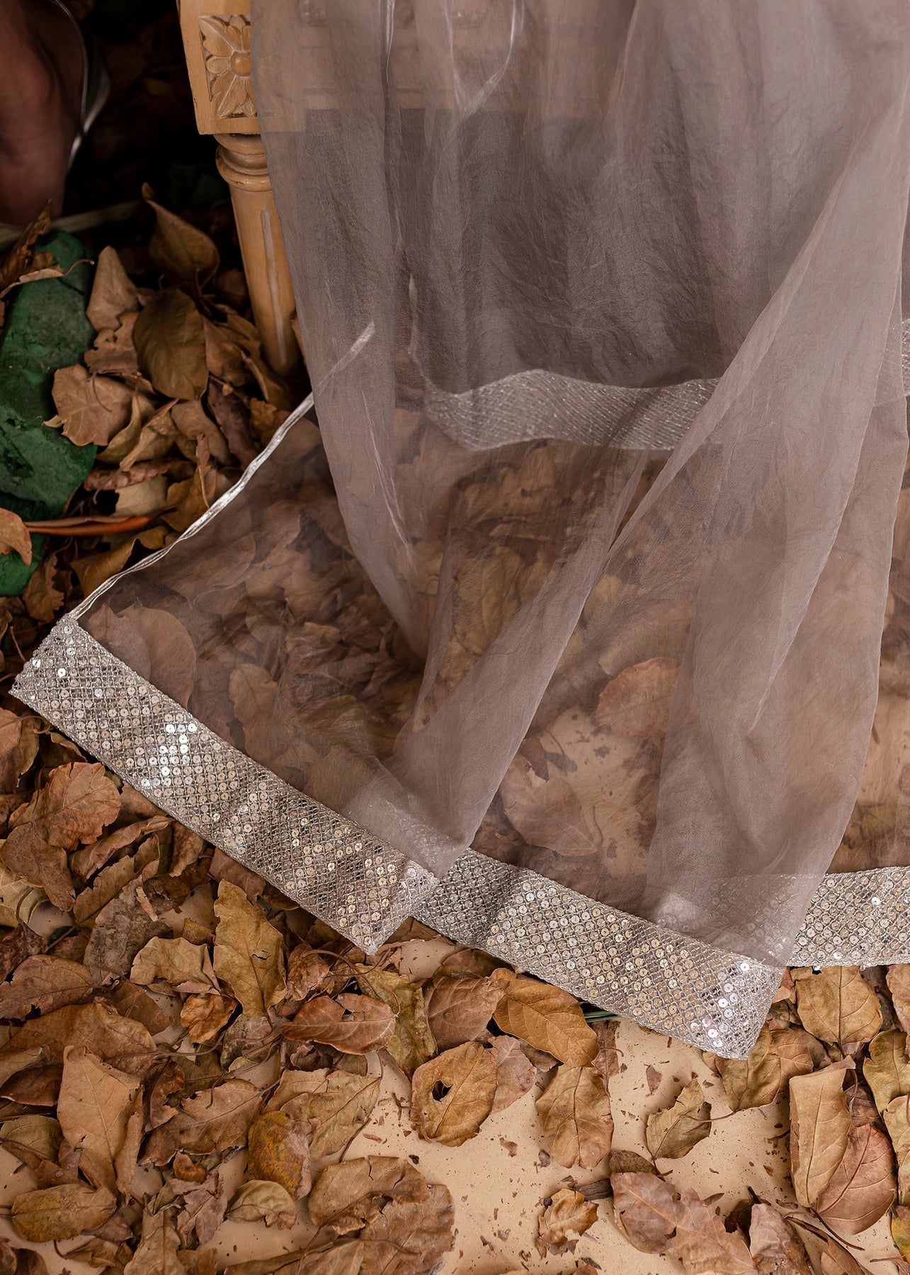 Amber, made on a soft bed of Silk. This graceful grey silk set features a boat neckline adorned with glamorous stone work, the sleeves are heaving embellished with sequins,stones and cut dana. Comes with a shiny organza dupatta. Perfect for all your day and night forrmal events!