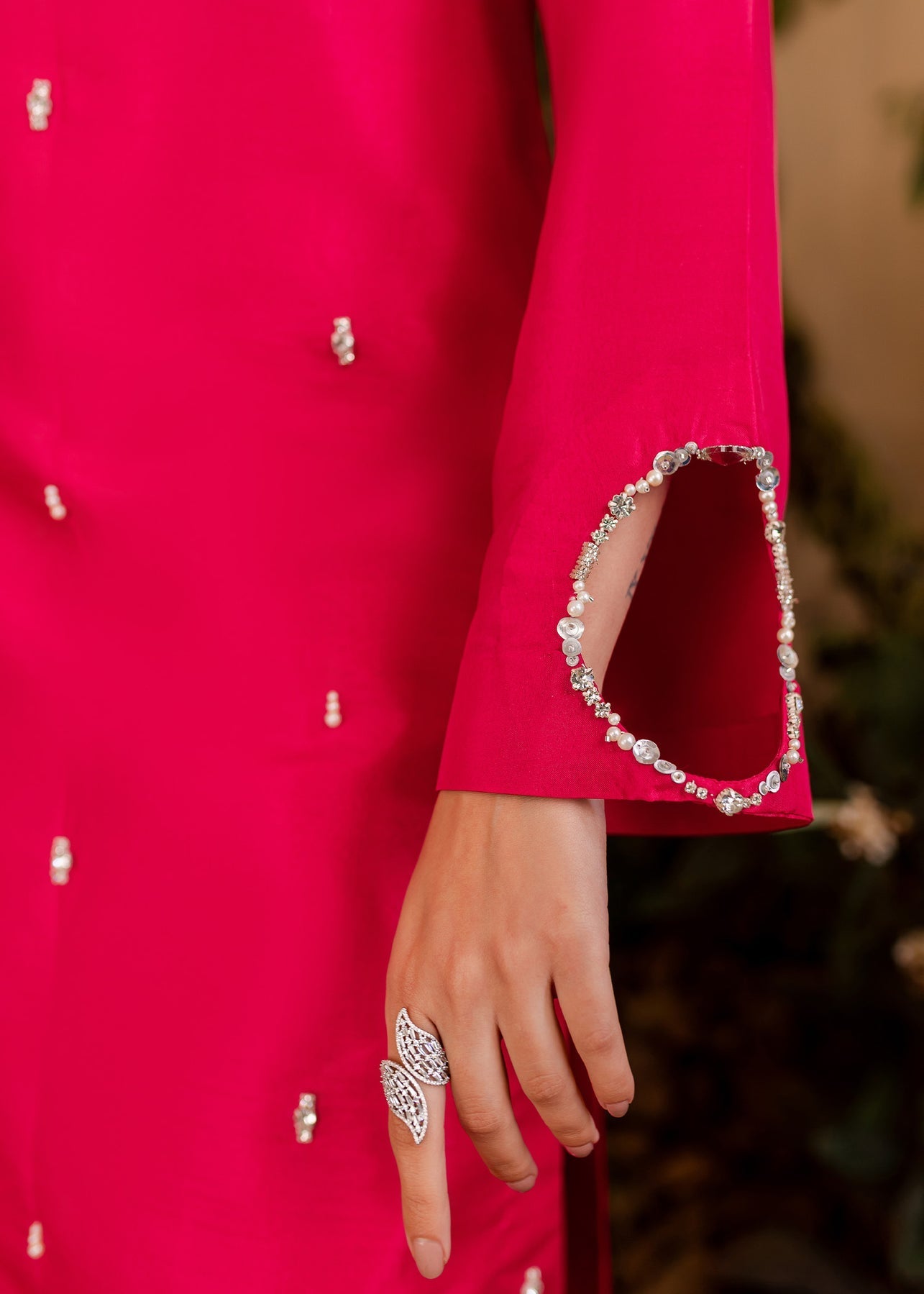 Ela exhibits exquisite artistry. An enchanting figure swathed in the ethereal hue of Hot pink, adorned with a mesmerizing ensemble that boasts a palette of silver tones, casting an aura of sheer luxury. These intricate adornments find their perfect complement in an airy Organnza dupatta. Paired with flared pants to complete the look.
