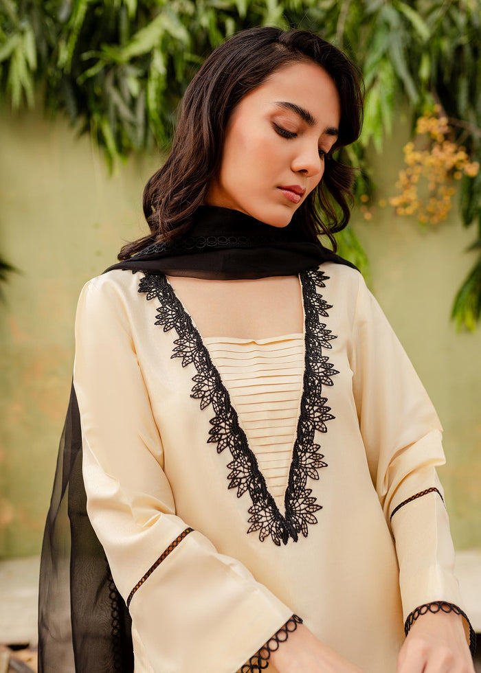 Jamine, A perfect fit for summers. Features a resplendent silouette on a bed of silk in a soft ivory shade, furtermore layered with lace details It comes paired with wide pants and organza dupatta with borders.
